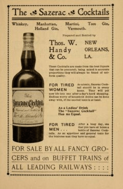 It was long believed that the Sazerac was the first modern cocktail. This is now disputed, especially given that (1) there are references in print before any form of a Sazerac is known to have existed and (2) Sazerac was initially referencing a brand of cognac called Sazerac-de-Forge et Fils and then later was a cocktail bottling company. Listen to the podcast to learn more, but ultimately what we know as a Sazerac today is based off of the Sazerac bottling company’s most successful bottled cocktail (yes, they were popular in the late 19th/early 20th century just like today). Below are some advertisements for bottled Sazerac cocktails.