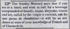 However, we don’t see a definition of what a cocktail is (or was) until The Balance, Columbian Repository, 13. May 1806. It was defined as “A stimulating liquor composed of any kind of sugar, water, and bitters” which does resemble what we know of as a cocktail today.