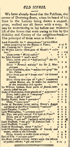 Unlike most people think, the term “cocktail,” as far as we can tell from printed evidence, didn’t originate in America. The cocktail first appears satirically in print in 1798 in a London newspaper called The Morning Post and Gazetteer. The backstory goes that the week before an article had been published that the owner of the Axe and Gate tavern on the corner of Downing and Whitehall that politicians frequented won a share of the lottery and joyfully used a mop to erase his regulars tabs. The satirical article published the next week was a tongue-in-cheek follow-up with a list of politicians (who may or may not have actually frequented this pub) and the monies they “owed” for the drinks they drank, including Tory politician William Pitt (the younger) who would go on to be Prime Minister. Apparently William Pitt, seen at the bottom of this article, owed for “L’huile de Venus”, “perfait [sic] amour” and a less French drink: “cock-tail” (vulgarly called ginger).”