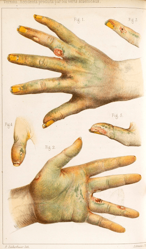 Hands damaged by arsenic dyes, lithography from an 1859 medical journal (via Wellcome Library) Green wallpaper was also incredibly popular at the time, especially from William Morris (one of the major figures of the British Arts and Crafts Movement) who loved greens made from arsenic-based dyes. He was highly skeptical of the poisonous nature of arsenic even while he embraced using organic dyes. Unsurprisingly, this was because there was no organic option available to achieve the brilliant, colorfast green he wanted. This effectively rendered the wallpaper people had throughout their homes toxic, particularly in damp environments where the mold caused it to be aerosolized. Here is an example of one of his poisonous and popular – and Caitlin’s all-time favorite wallpaper – patterns: