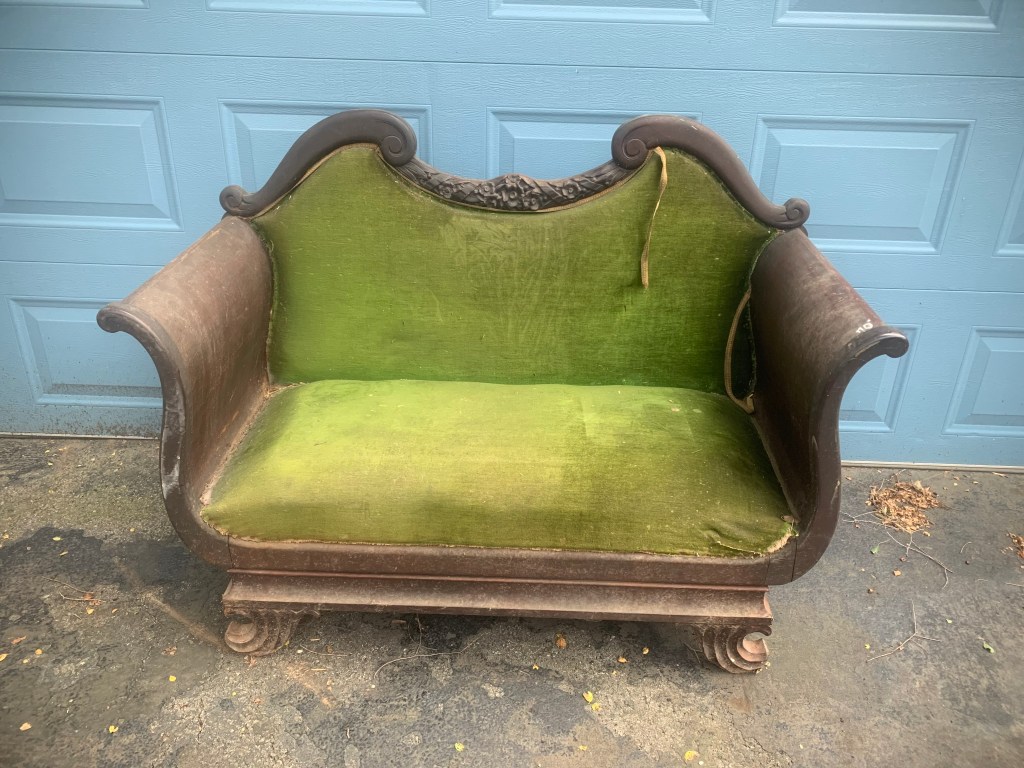 Check out the picture of Caitlin’s recent antique settee/loveseat purchase below. We need you to vote (below the pic) if you think we should get it tested for arsenic before getting back to restoration. And, on the off chance someone wants to, shoot us an email if you’d like to sponsor this testing.